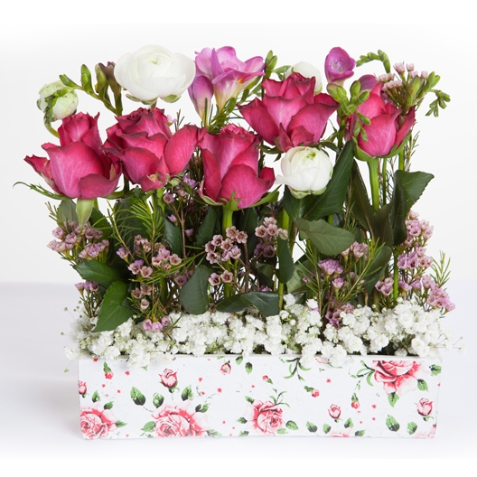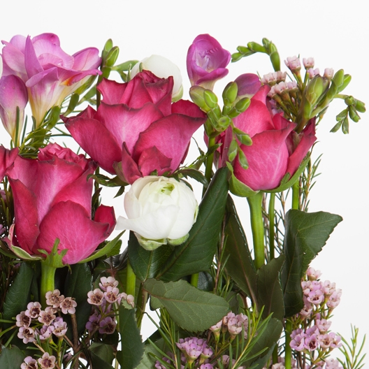 Composition florale présentée dans un joli contenant tendance, composée de roses rose et de freesia rose et blanc, touche de waxflower et de gypsophile.