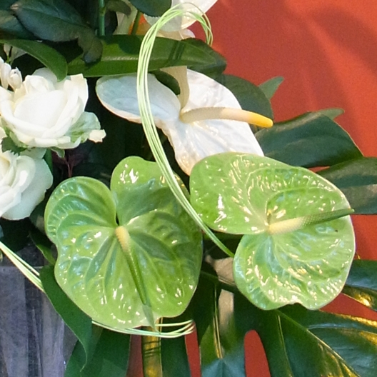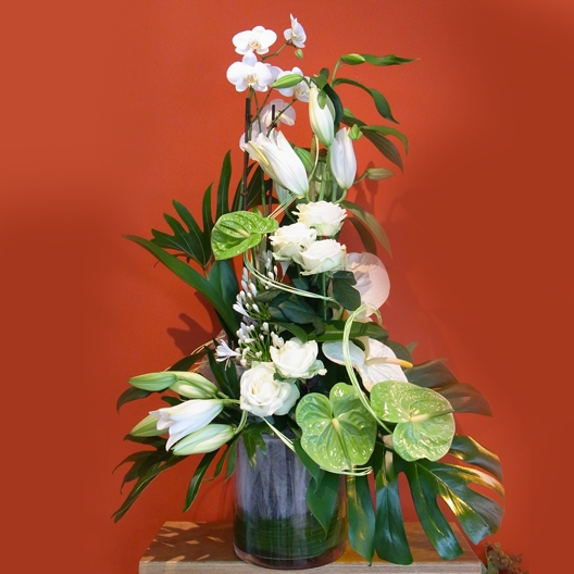 Très belle composition présentée dans un contenant en verre habillé de feuillages, composée d’un phalenopsis plante, de lys orientaux blancs, de roses blanches gros boutons, d’anthurii blancs et verts, d’aganthe blanches en saison (d’avril à juin) ou d’amimajus et agrémentée de feuillages exotiques et de volutes de rotin blanc.
