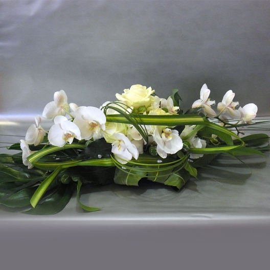 Composition florale de forme allongée (idéal pour une centre de table de cérémonie), présentée sur un contenant simple et non visible, composée d’orchidée blanche (en saison d’avril à septembre), des roses blanches gros boutons, d’une touche d’hortensia blanc et rehaussée d’un très beau travail graphique de feuillages exotiques.