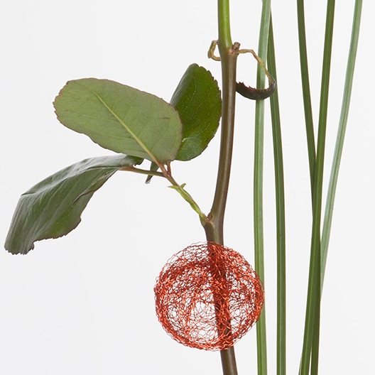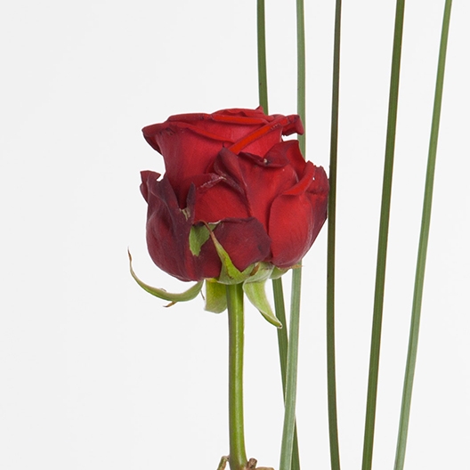 Rose rouge 70 cm, accompagnée de stellgrass rehaussé d’un léger décor rouge et présenté dans un petit soliflore en verre.