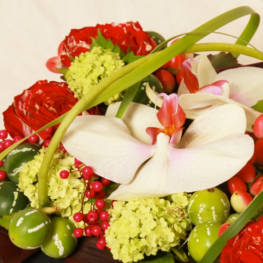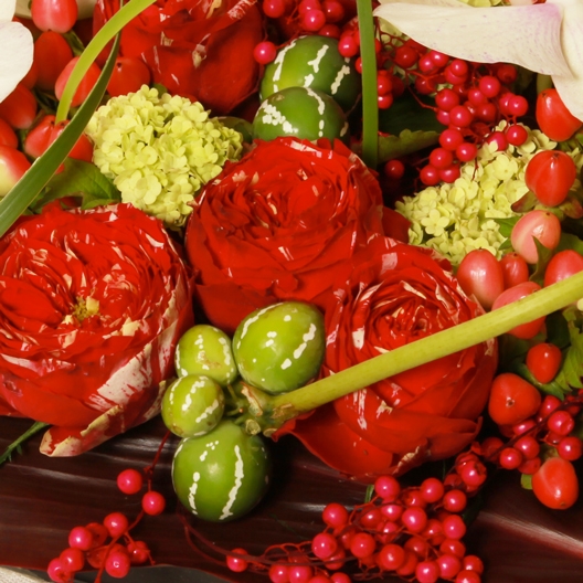Composition florale présentée dans un contenant en zinc, présentée sous la forme d’un tableau floral réalisé à base de roses rouges, hypericum, poivre, diplocyclo, fleurons de phalenopsis, viburnum ou œillets verts en fonction de la saison et rehaussée de boucles de typha.
